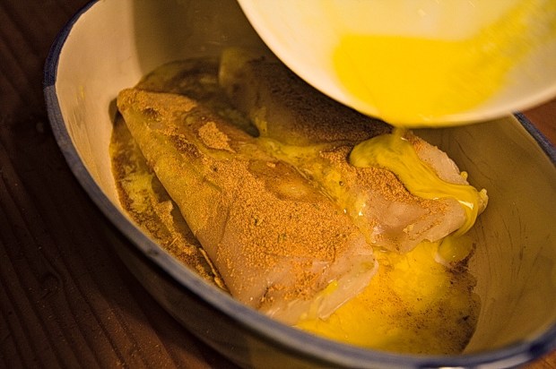 - Now, pour half of the melted butter onto the fillets. You’ll notice the butter immediately coagulates due to science. Don’t stress, it will melt again in the oven. Turn the fillets around and do the same on the other side. First spice, then butter.