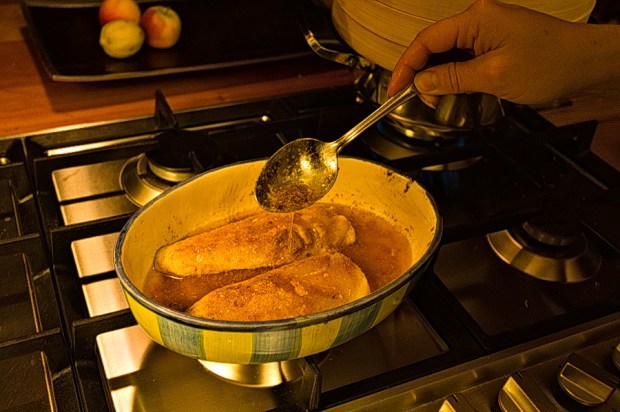 Round about now, take your fab hake fillets out, flip them over, and re-drench them in the melted butter using a spoon.