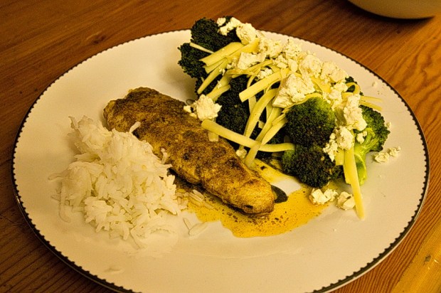 It’s Monday night. I haven’t gone grocery shopping since last week and I’m lazy. There aren’t any leftovers except for a small container of basmati rice, but there are frozen hake fillets in the freezer and a head of broccoli in the fridge.