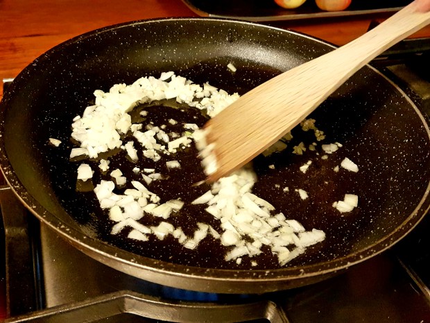 - First, fry the garlic and onions in a pan over low to medium heat until fragrant and slightly tanned. Keep the leftover oil in the pan for the fishcakes. It adds lovely flavour.