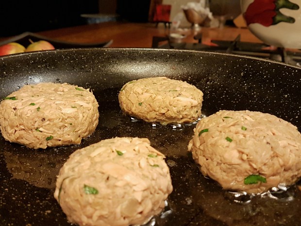 Mix the all the listed fishcake ingredients in a bowl along with the fried onion and garlic. Add a lot more pepper than salt. Leave the oil out of this mixture – that’s just for frying.