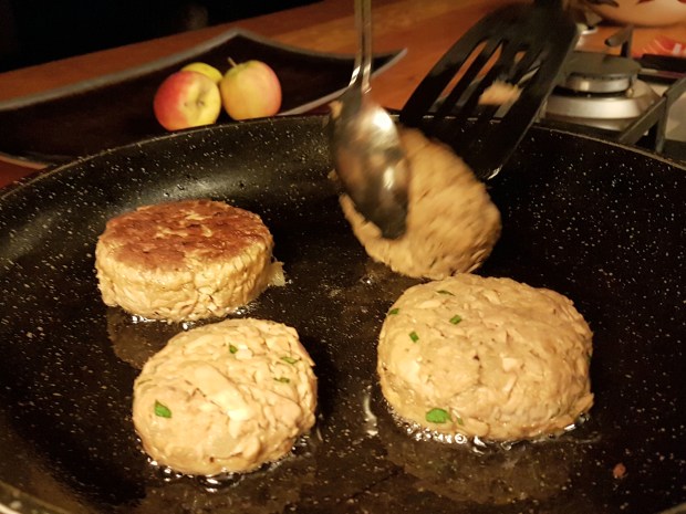 One by one, carefully put your fishcakes into the frying pan over low heat.