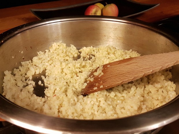While the other side fries, get out another frying pan. Pop it on the stove and melt a big spoonful of butter on high heat. Add your desired amount of cauli rice and stir it around for about 5 mins until cooked.