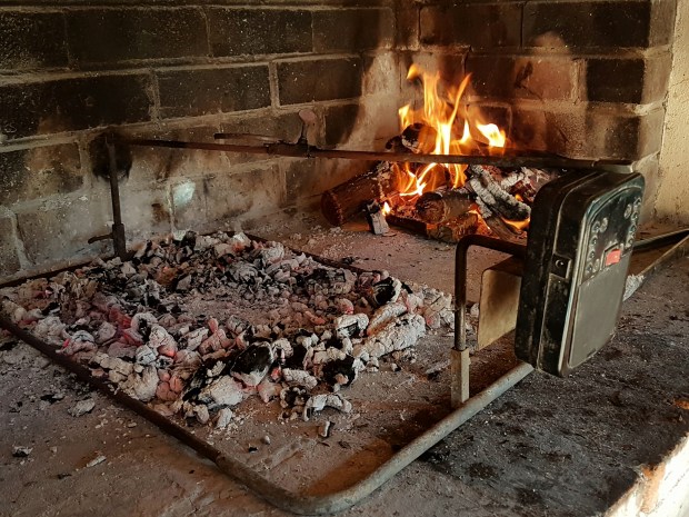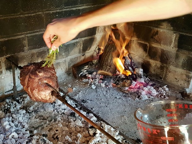 For optimum use of a rotisserie, it’s best to have a side-fire going. Periodically throughout Flippie’s incessant rotating, you’ll need to feed the coal-bed underneath the meat with new coals from the side-fire to keep the heat constant.