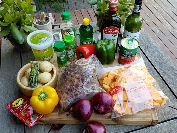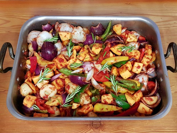 Add the butternut, onions, sweet peppers, baby potatoes, salt, pepper and origanum to a baking tray. Stir the tomato mix into the veggies until they are all nicely coated. Scatter the rosemary onto the veggies.