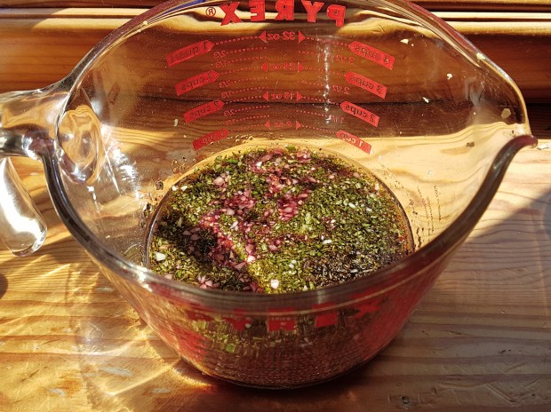 - Score the fatty side of the meat using a sharp knife. Get out a handy zip lock baggy that’s just the right size for your hunk of meat. Plop the meat into the bag and pour most of the basting sauce in there too. Leave a bit of the sauce for later. You’re going to use it to baste the meat while it’s cooking. Seal the bag tightly. Put the bag of marinating meat in the fridge until your coals are ready for action. The longer the better.