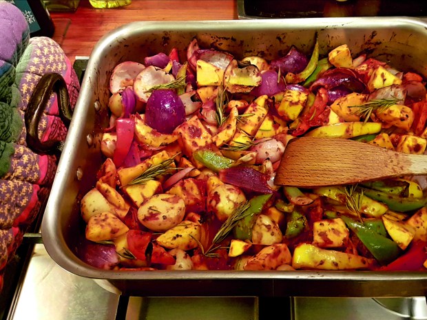 - Add the butternut, onions, sweet peppers, baby potatoes, salt, pepper and origanum to a baking tray. Stir the tomato mix into the veggies until they are all nicely coated. Scatter the rosemary onto the veggies.