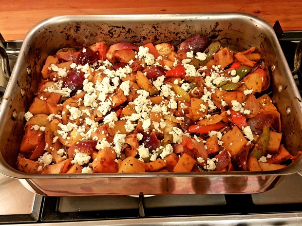 Take the tray out of the oven and crumble feta cheese over the veggies. Pop it back in for another 5 minutes.