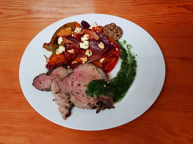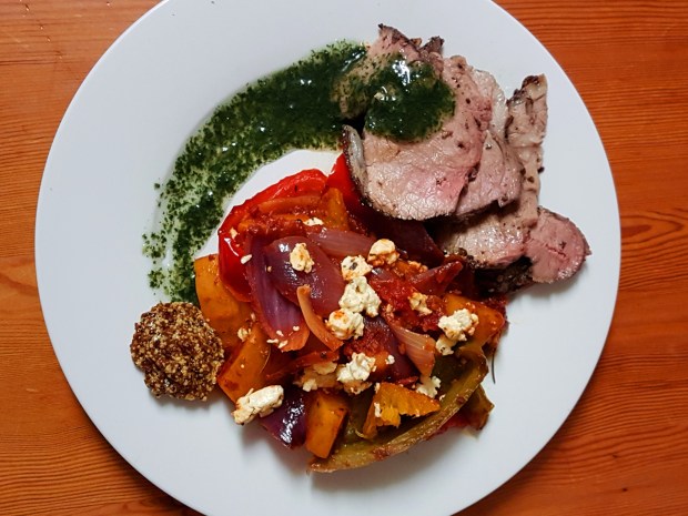 - Dish up with veggies on the side, and serve with whole grain mustard and mint sauce.