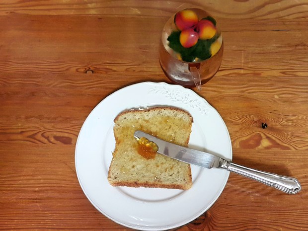 - Generously spread apricot jam on each slice of bread.