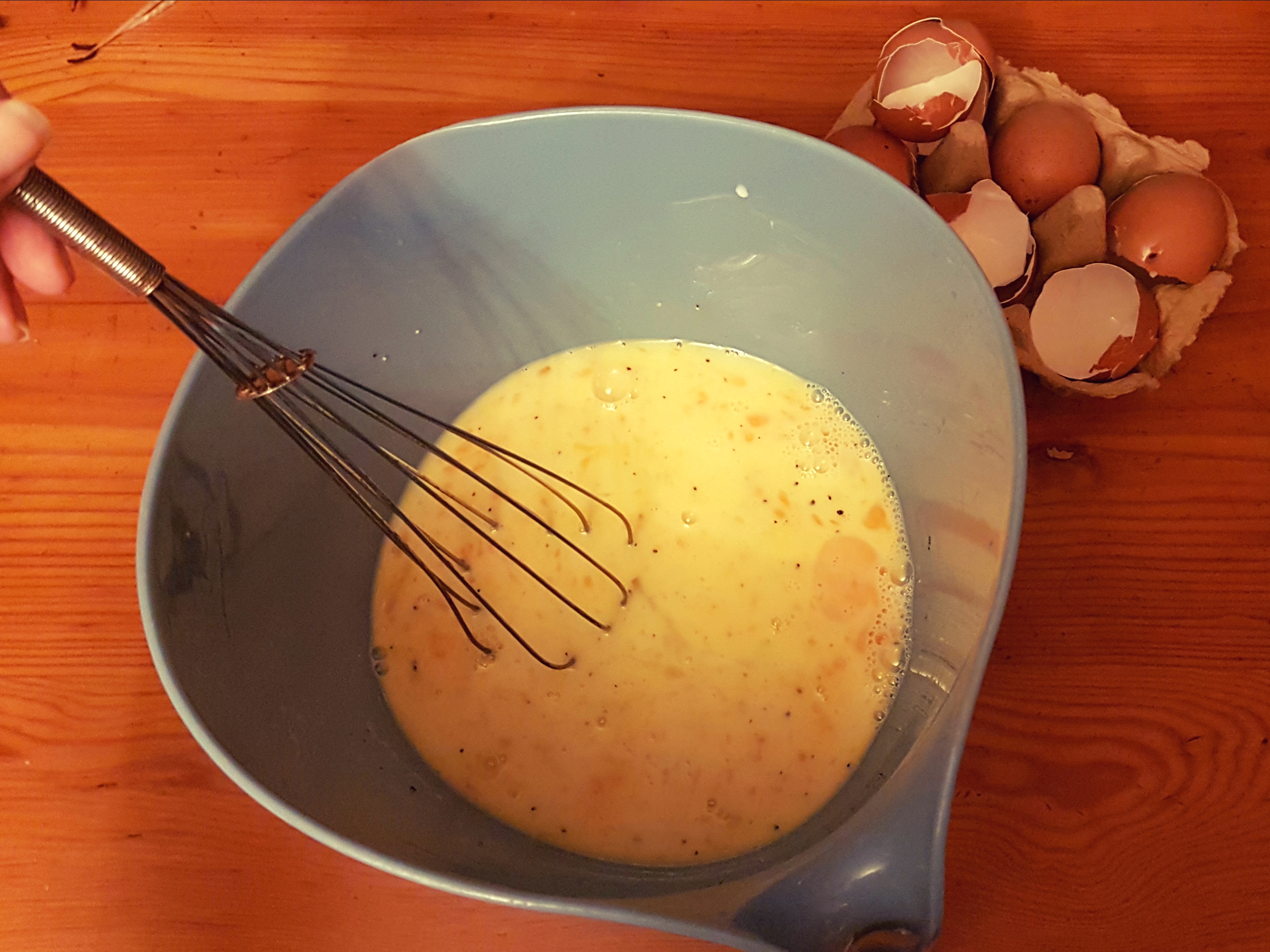 Preheat the oven to 180 degrees Celsius. Whisk together the eggs, milk, a sprinkle of thyme, salt and pepper.