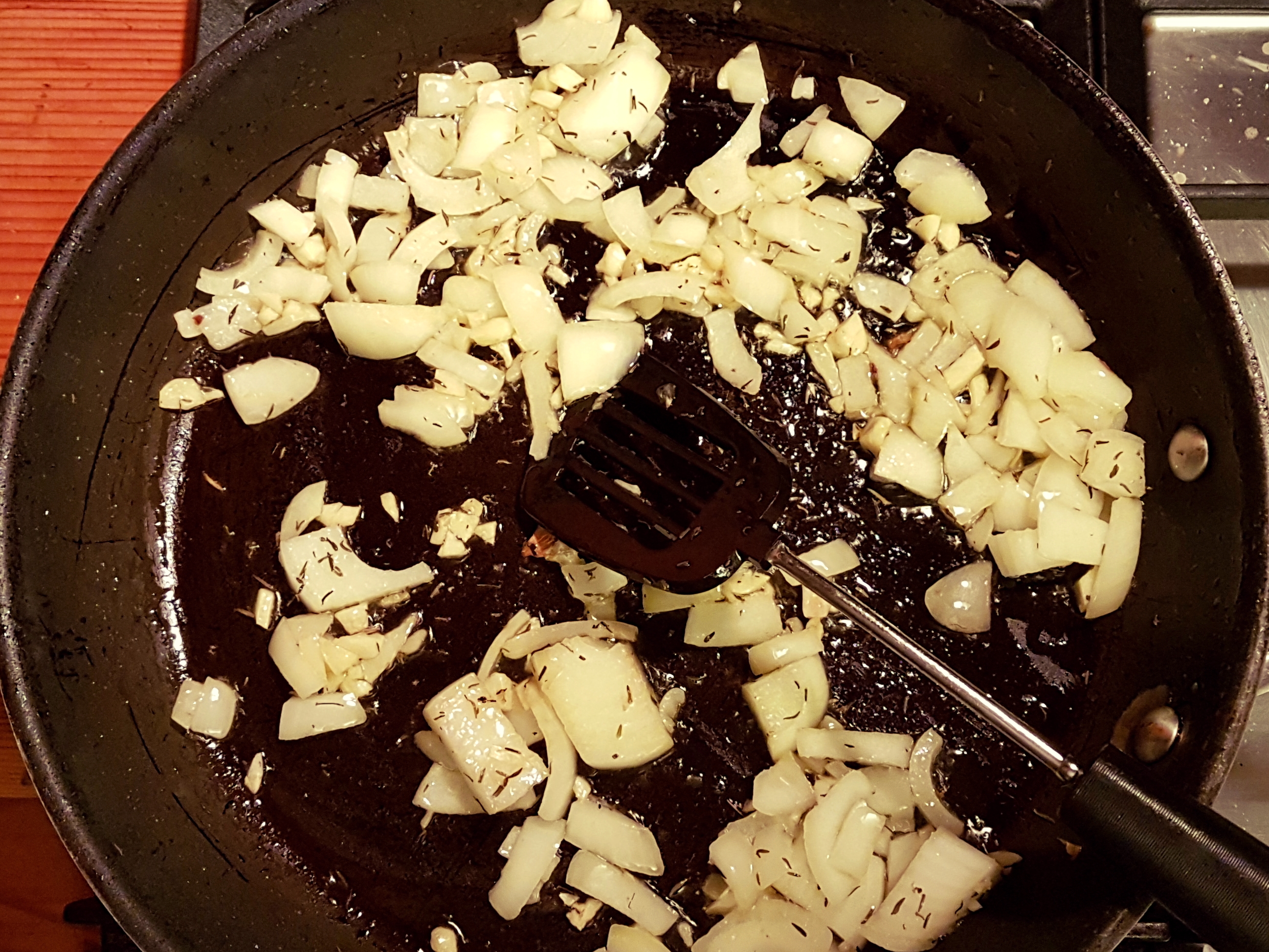 3. Remove the sweet potatoes from the frying pan and keep them aside. Sauté the onions, garlic and the rest of the thyme in olive oil, over medium heat for 4 minutes.