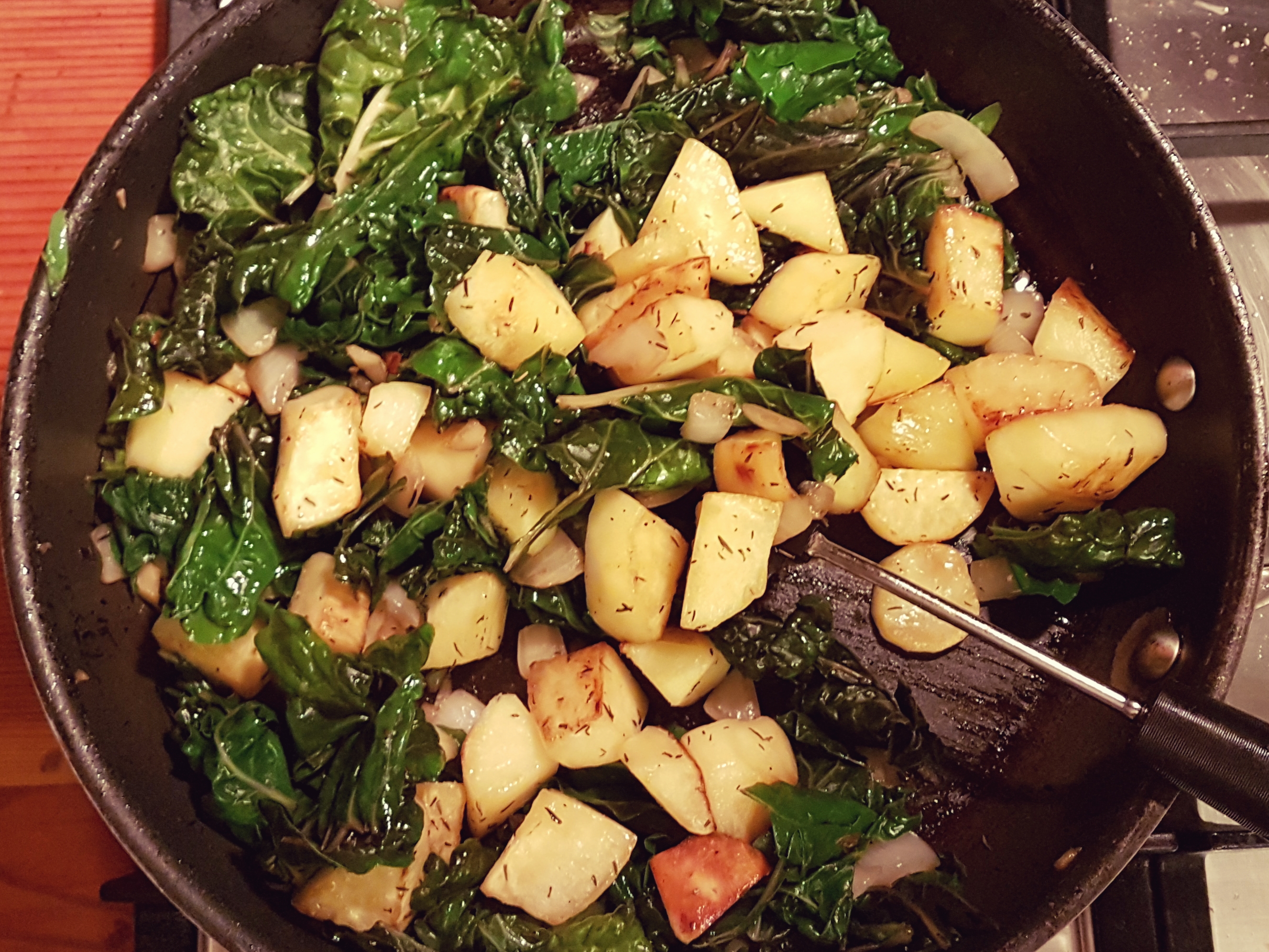 5. Add the sweet potatoes to the frying pan and give it all a good stir.