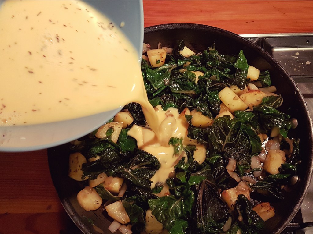 Pour the egg mixture over everything and let it cook for another 3 minutes.