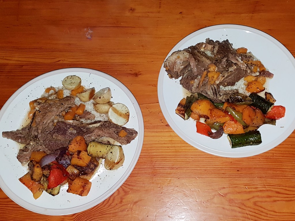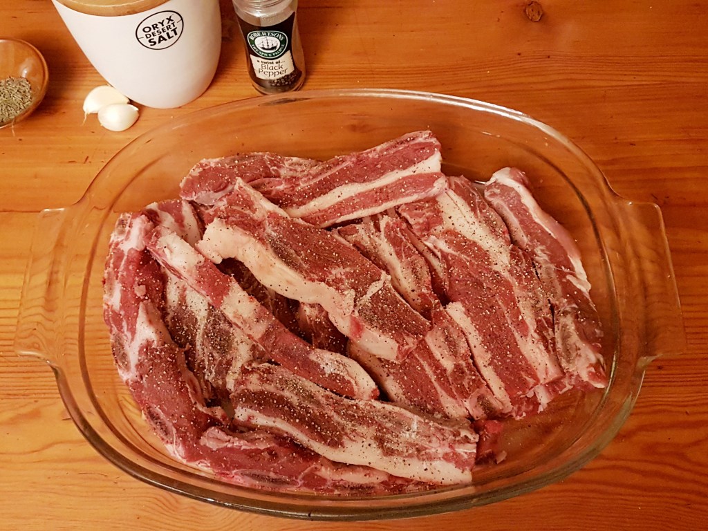 Preheat the oven to 200 degrees Celsius for the veggies. Pat the beef dry and coat both sides liberally with salt and pepper. Don’t hold back on the pepper!