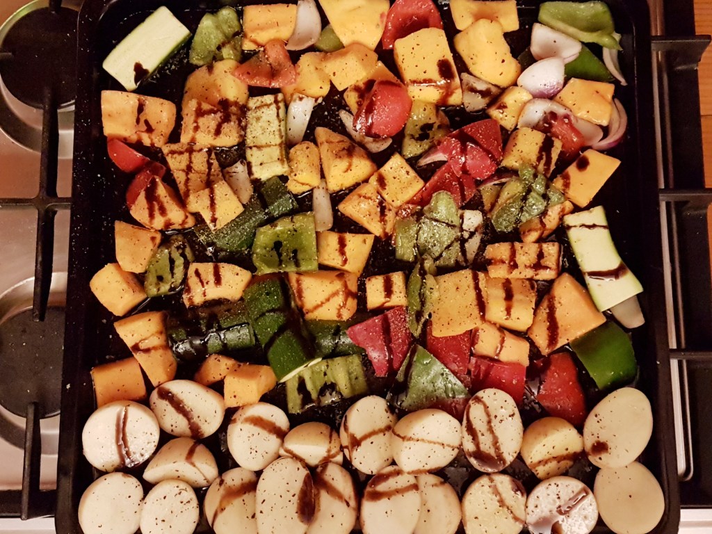 - Get all of your veggies onto a baking tray and drizzle generously with olive oil. Sprinkle salt, pepper, oreganum and garlic powder over everything. Lastly, drizzle with balsamic vinegar.