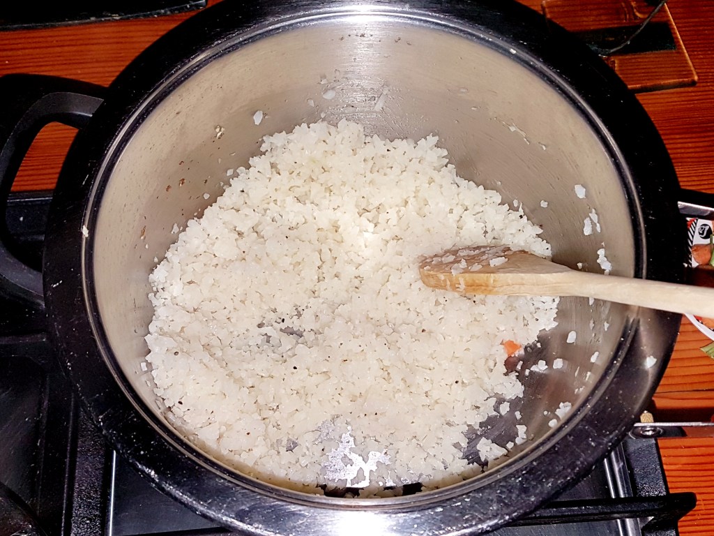 Boil 400ml water in a pot on the stove. Add the frozen cauli rice and let it boil for about 5 to 8 minutes. Once done, strain it and add the butter to the same pot, stirring it into the cauli rice for 2 minutes over medium heat. Don’t forget to season with salt & pepper.