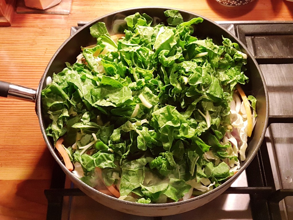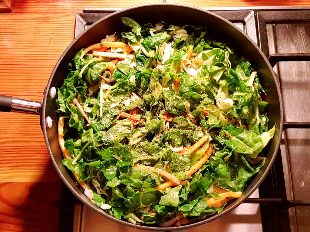 - Add the stir-fry veggies to a hot pan with the olive oil already heated up. Stir it for 30 seconds and then spice the hell out of it.