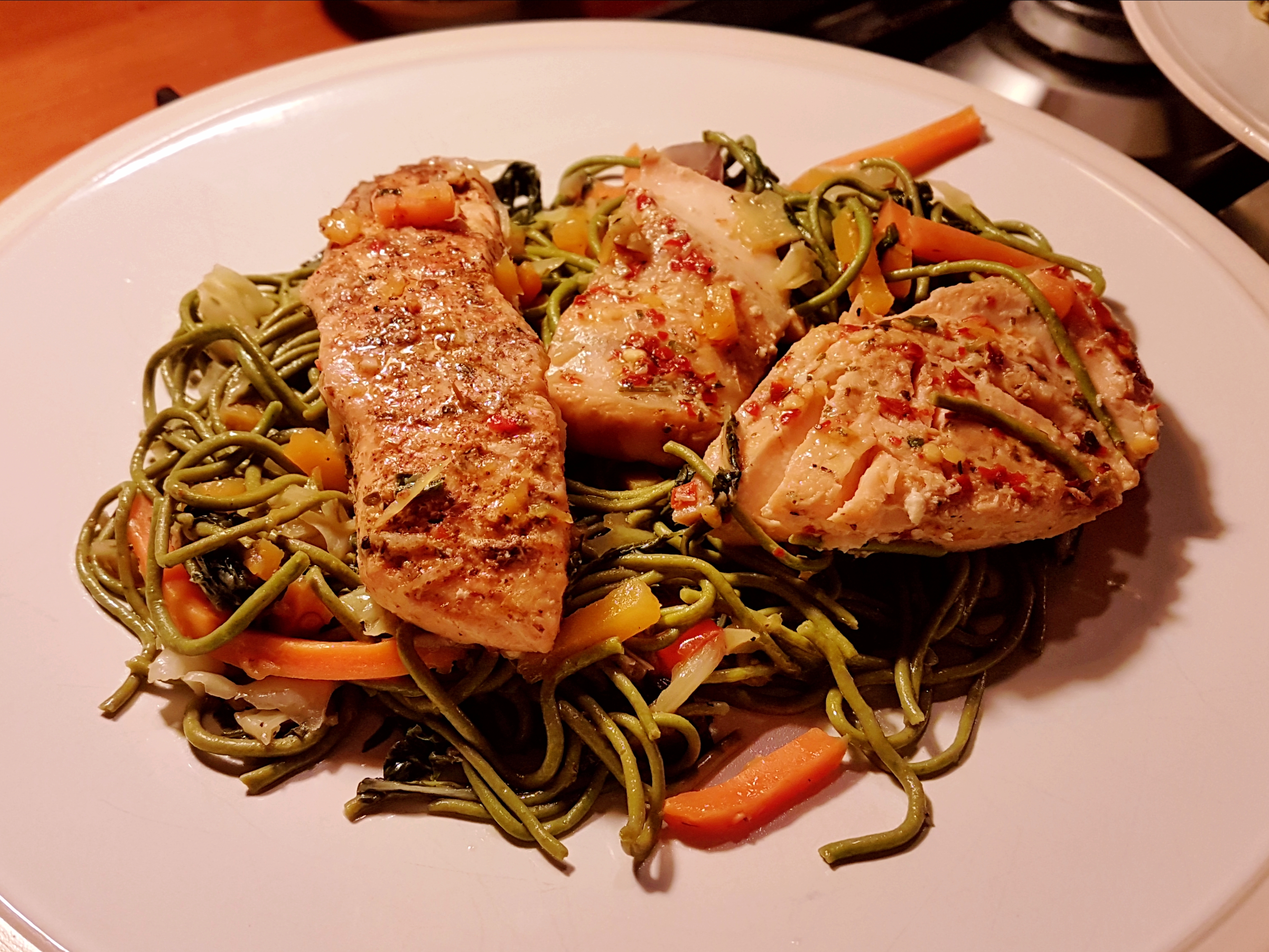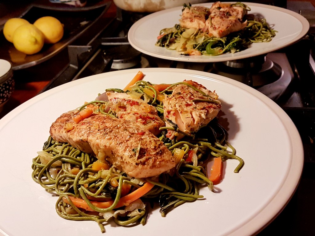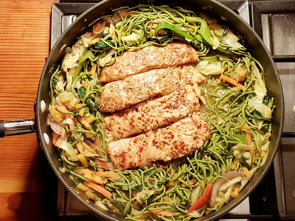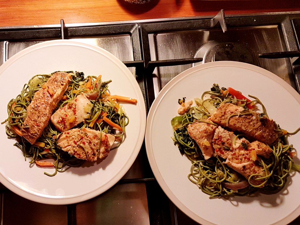So off to Woolies I went to get a pack of veggie noodles, and in the process also grab some salmon, stir-fry veggies and a stir-fry sauce too. I can’t take any credit for this meal. It’s all Woolies in all its ‘easy to cook’ wonder!
