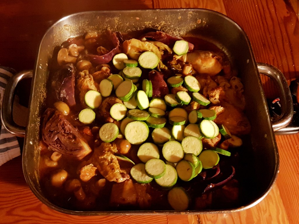 45 minutes in, add the rest of the baby marrow. Stir it and close her back up.