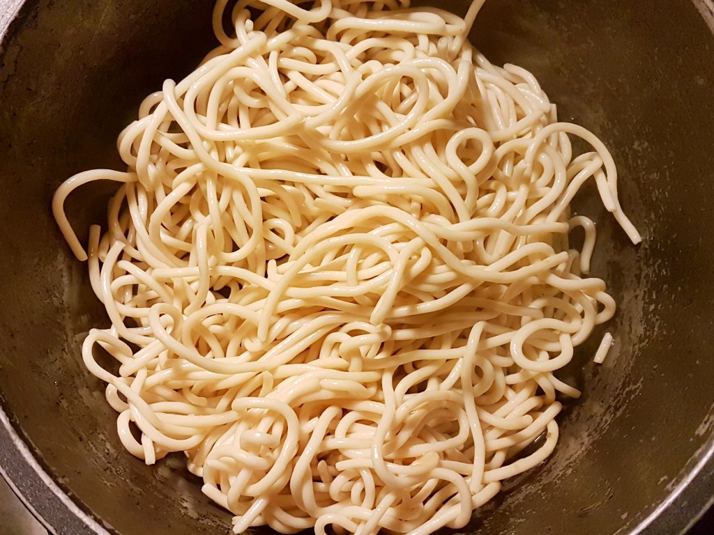 - Let it simmer on very low heat while you gently fry the cauli noodles in a small pan or pot with a little olive oil. It only takes about 3 minutes.