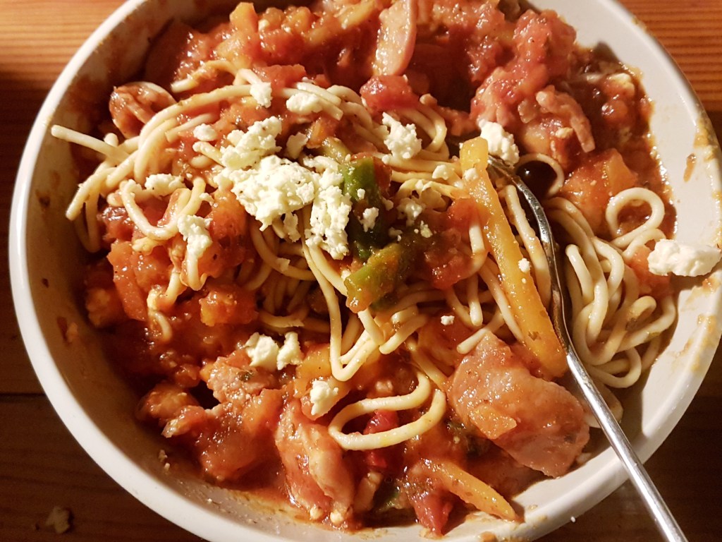 - Dish a big helping of pasta with loads of sauce on top and crumble some feta cheese over it.
