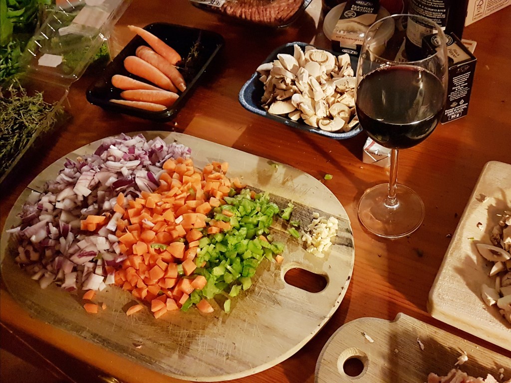 Chop, slice and dice until you’re ready for action. Get a big gulp of wine early on in the game, because it’s going to be a marathon. I had a glass of Namaqua’s Cab Sauv.