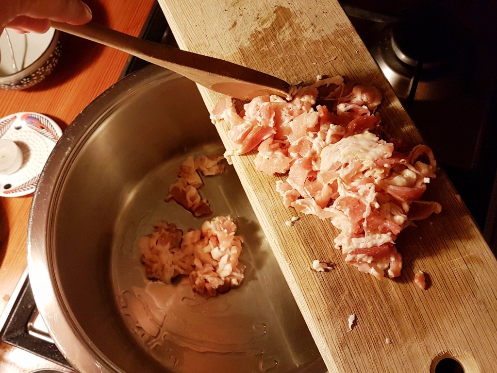 - Fry the bacon in some oil until the fatty ends are golden and it smells like breakfast time.