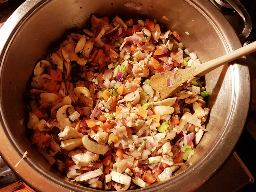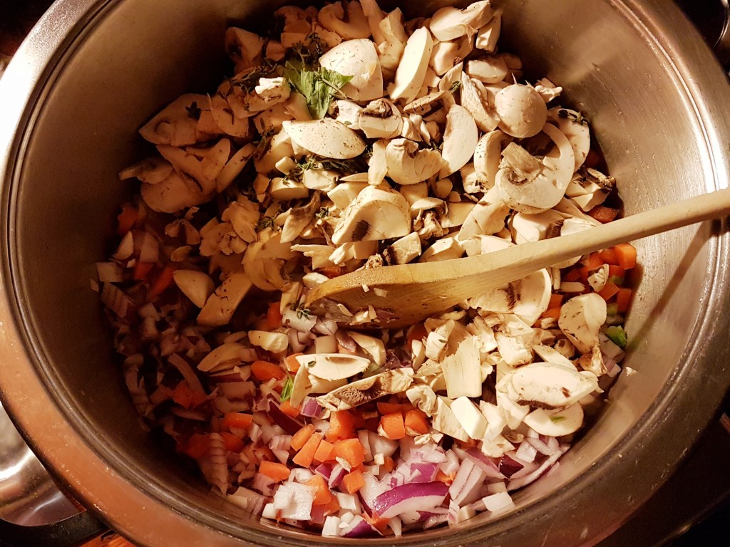 - Add the onions, garlic, carrots, celery, mushrooms and thyme and cook for about 10 minutes.