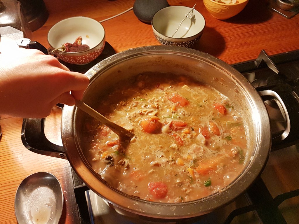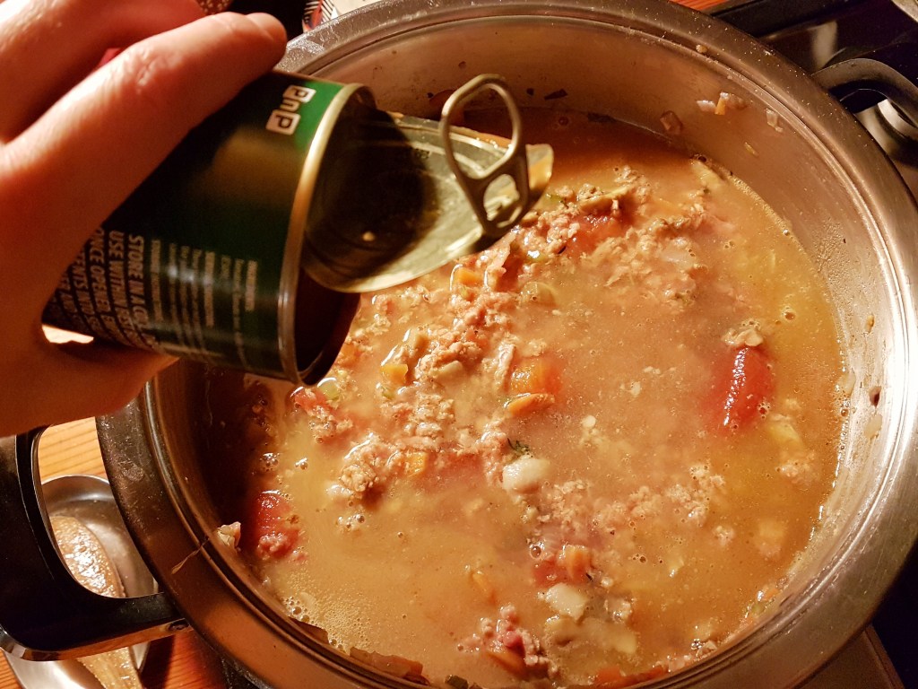 - Fill the two empty tomato cans with water and add that to the pot, too.
