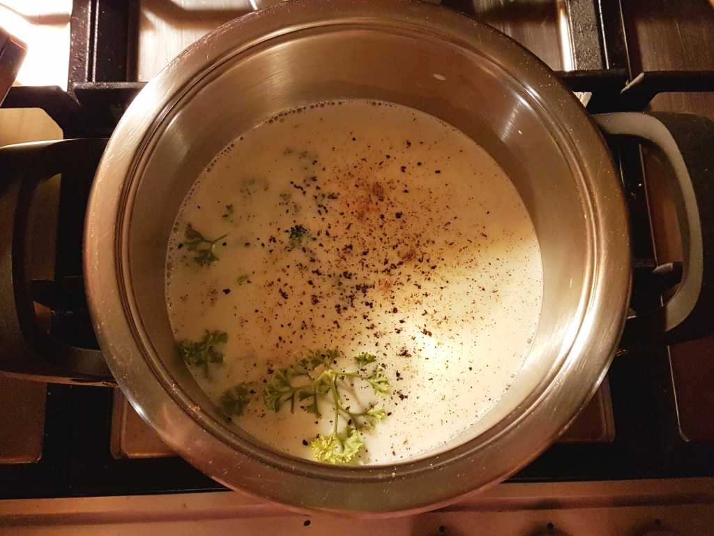 When the bolognese filling has thickened to your liking, turn the heat off and start making your white sauce. Add the milk, parsley, nutmeg and pepper to a pot and bring it to the boil.