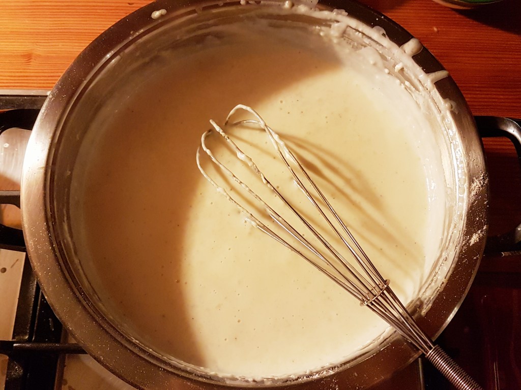 - Melt the butter in a pan over low heat and then mix in the flour, stirring in 1 splash of milk at a time to make a smooth roux.