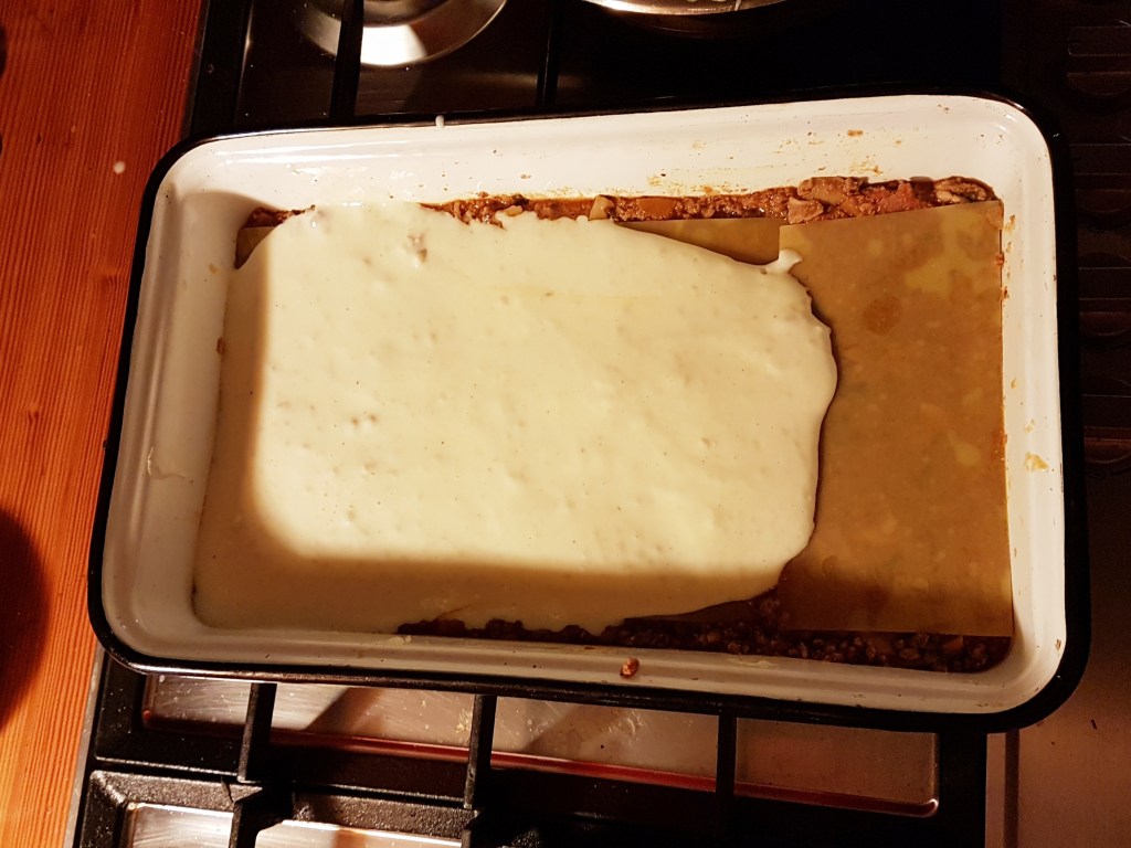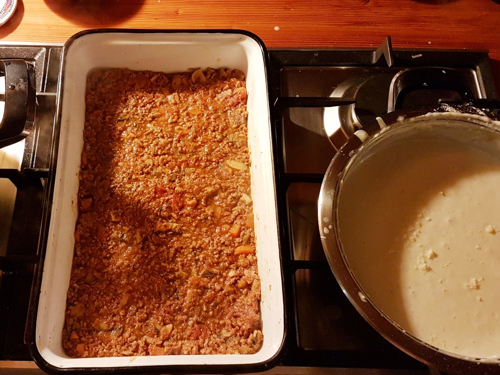 First, lay down a foundation of bolognese sauce in a large oven dish. Use about a third of the mincy mixture for each layer.