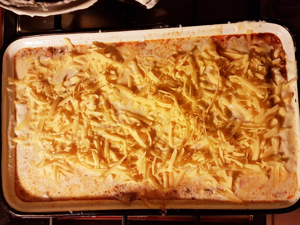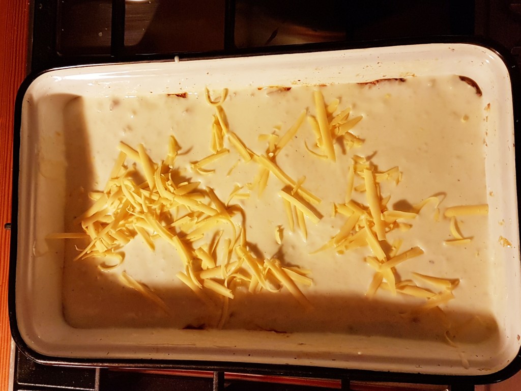 - I sprinkled some cheddar cheese on top of each layer of white sauce, but you can leave it all for the top if you prefer.