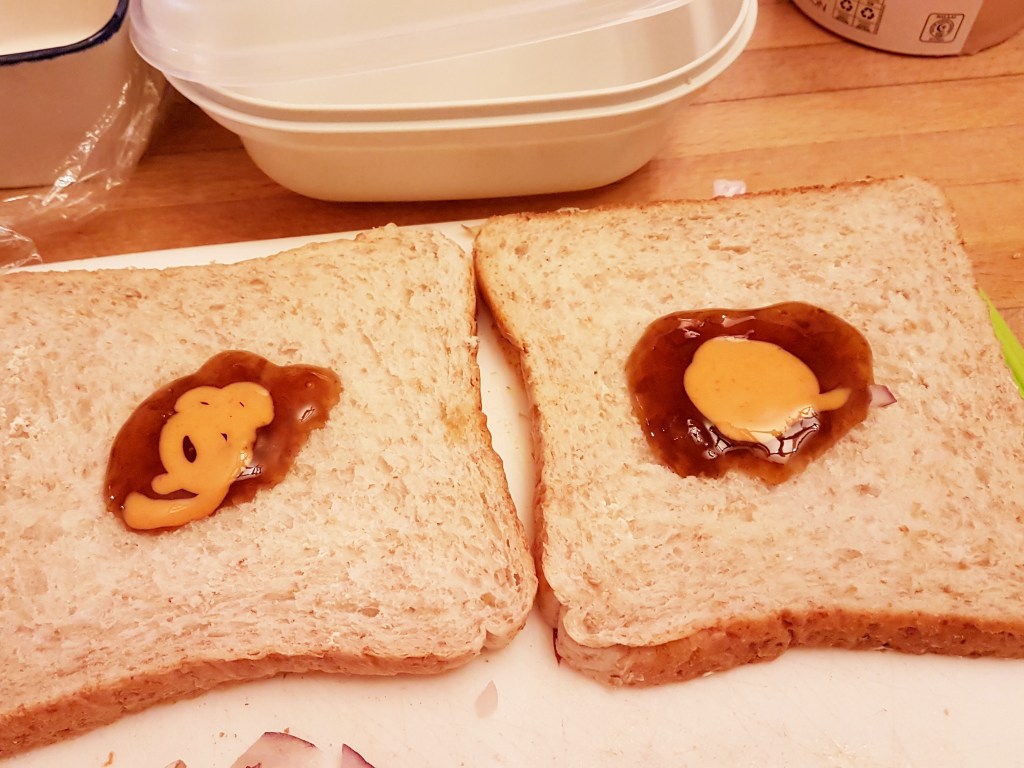 Flip the slices of bread over so the margarine is on the outside. Then plop dollops of chutney and sriracha mayo on each slice.