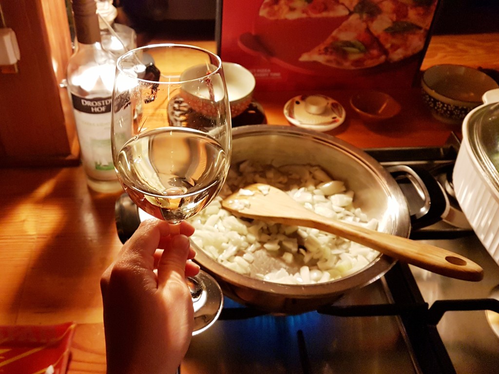 Preheat the oven to 180 degrees Celsius. Then get the process going with a glass of white wine. While you’re sipping, slowly sauté the onions and garlic in coconut oil, using a deep saucepan.