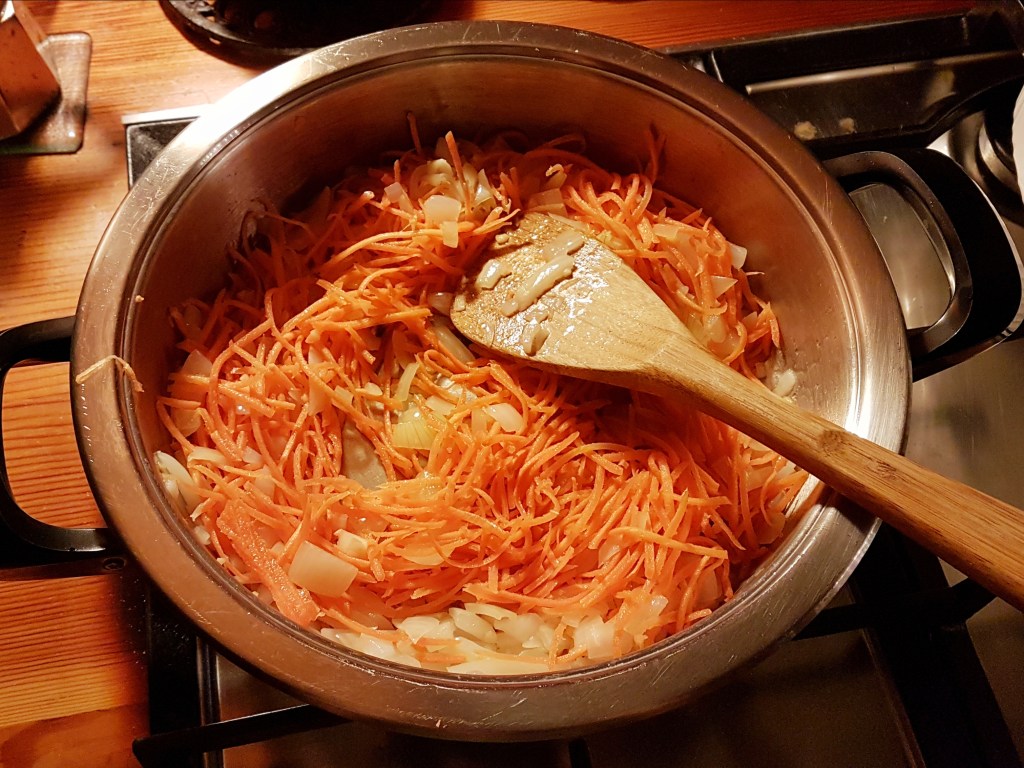 - Add the carrots when the onions are translucent. Keep stirring for 3 minutes.
