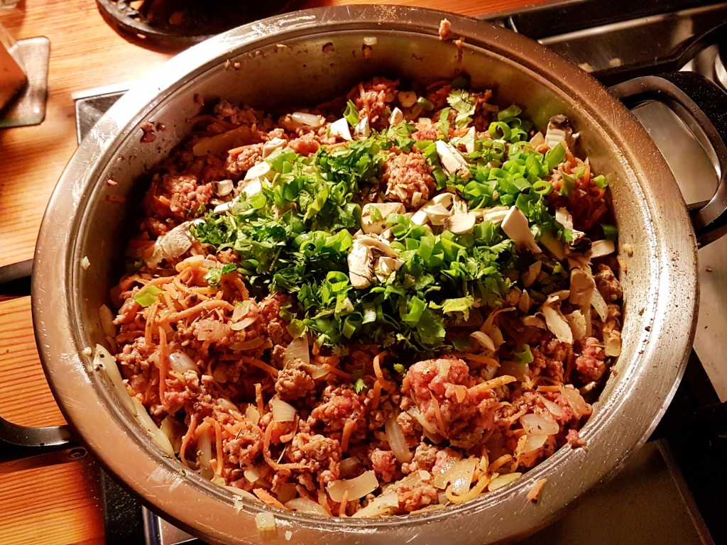 Keep stirring until everything is well combined. Then add the Worcester sauce, mushrooms, green onion and coriander.