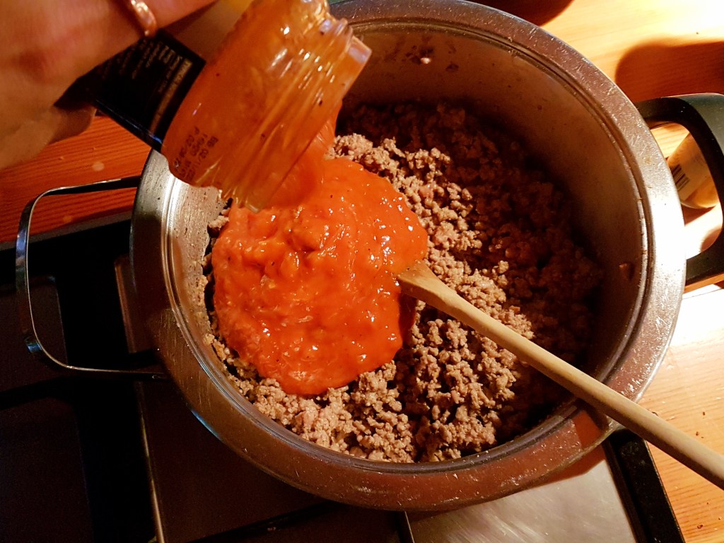 Now add the roast veg pasta sauce. Stir through on medium heat.