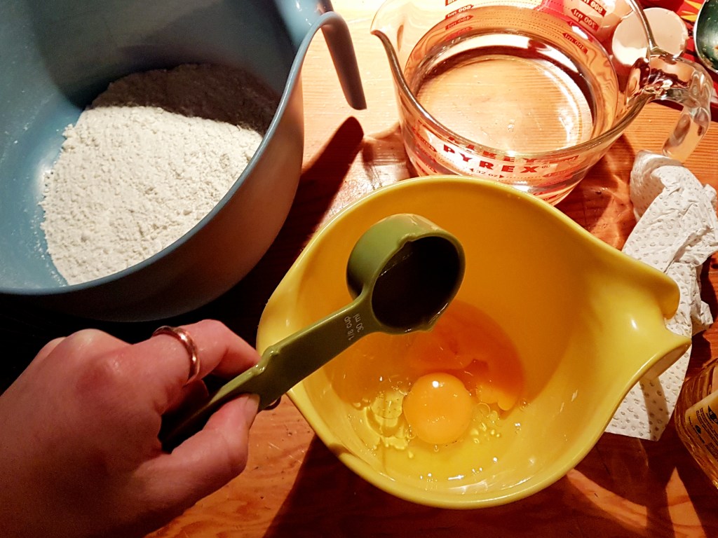 Start by pouring half of the pancake mix packet’s contents into a big mixing bowl. Add the eggs, oil and water to a separate bowl and mix it well.