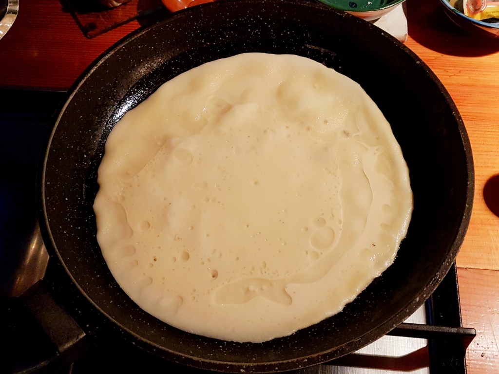 - Put your oven’s grill on, or preheat it to 200 degrees Celsius. Grab some delicious mince filling and spoon it onto the pancake in a sloppy middle-line.