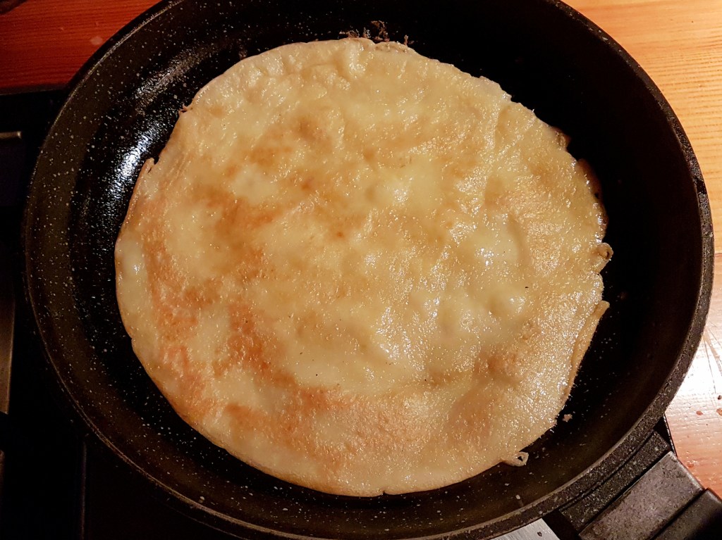 - After 3 to 5 minutes, the edges will start to curl up or brown. Flip the pancake.