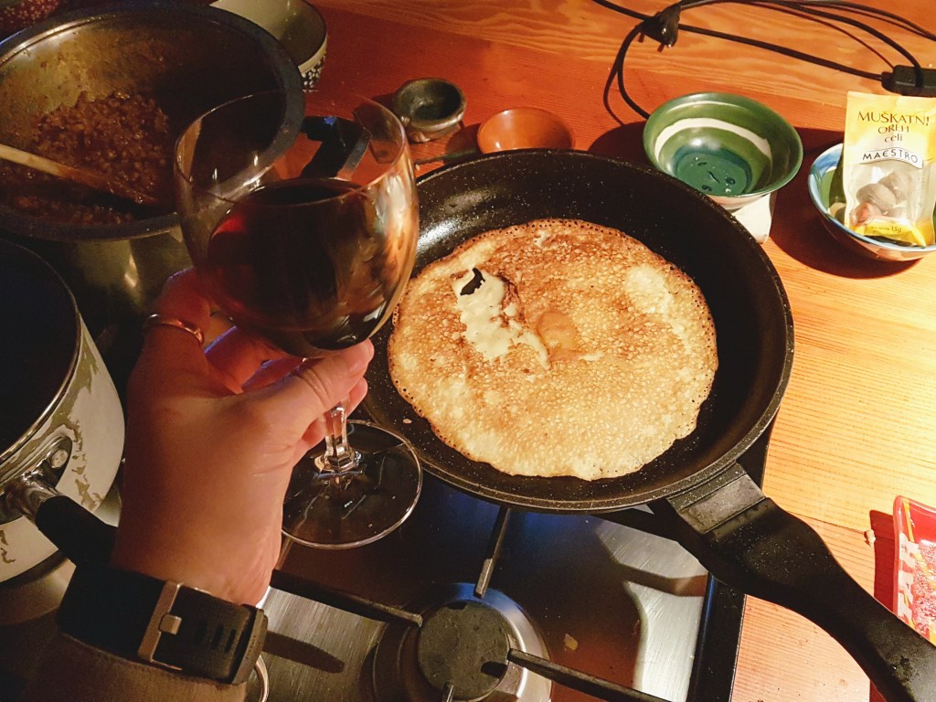 Keep making pancakes and filling them until your batter runs out. In the meantime, have a swig of your favourite wine. This process can take a while.
