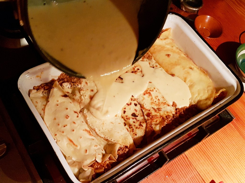 - Keep making pancakes and filling them until your batter runs out. Stack them all in the baking tray next to one another. In the meantime, have a swig of your favourite wine. This process can take a while.