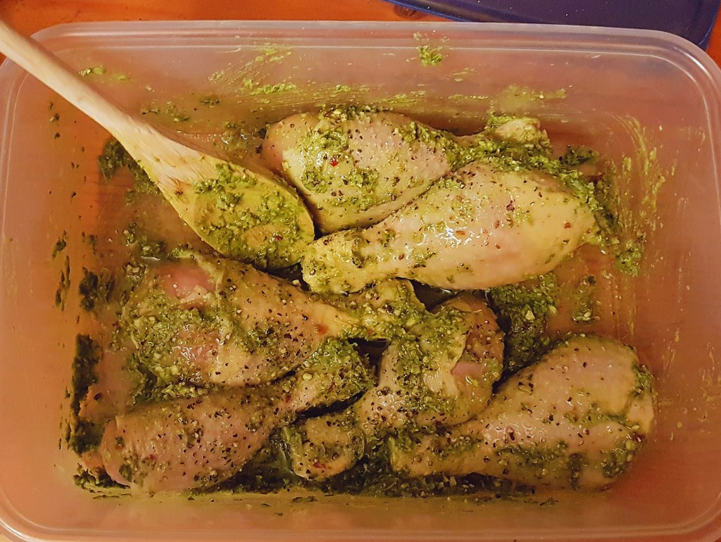- Put all of your chicken pieces into a container and add almost all of the basil pesto. Leave a little for later, to add to some of the other elements.