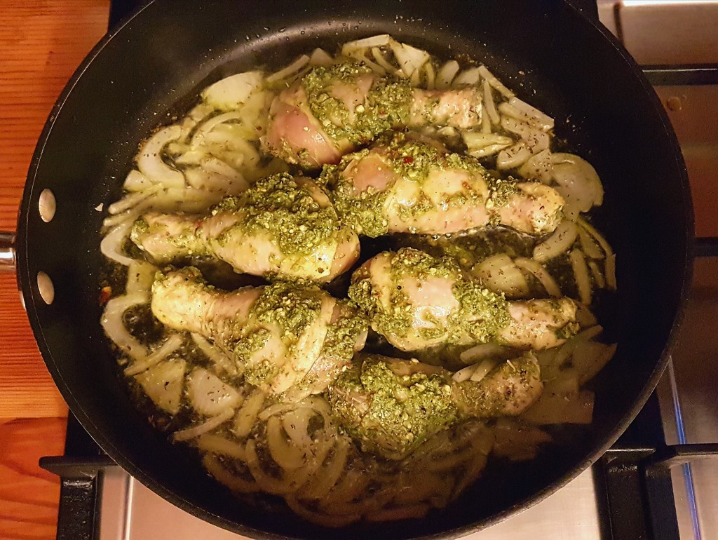 Put all of your chicken pieces into a container and add almost all of the basil pesto. Leave a little for later, to add to some of the other elements.
