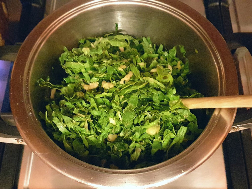 Brown one side of the chicken for 10 minutes. Meanwhile, get another pot on the stove for the spinach and green beans. Add a little oil to the pot and then add the spinach. Wilt it over low to medium heat. Don’t forget to season it.