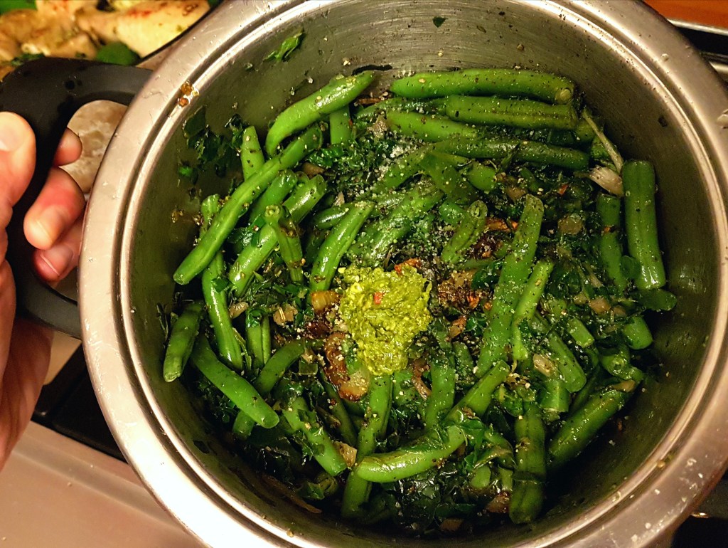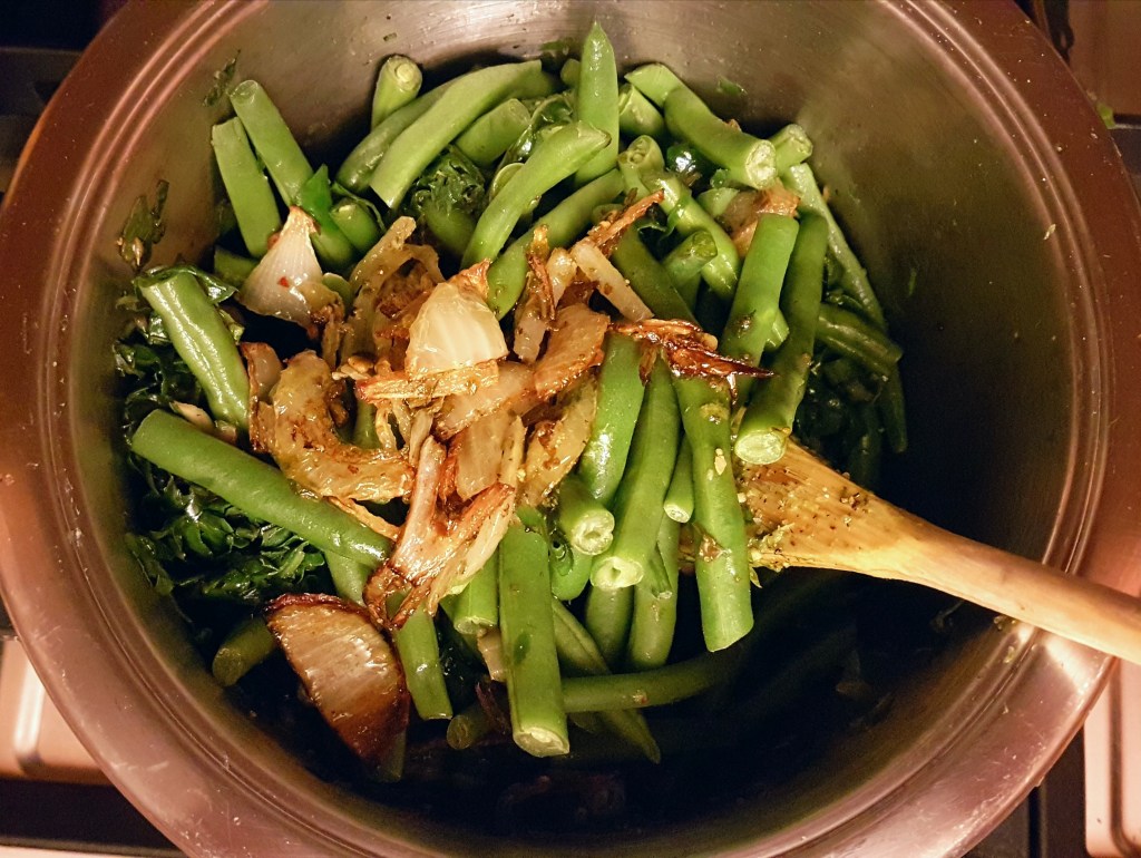 Take all of the onion bits out of the chicken pan and add them, along with the green beans, to the pot of spinach.