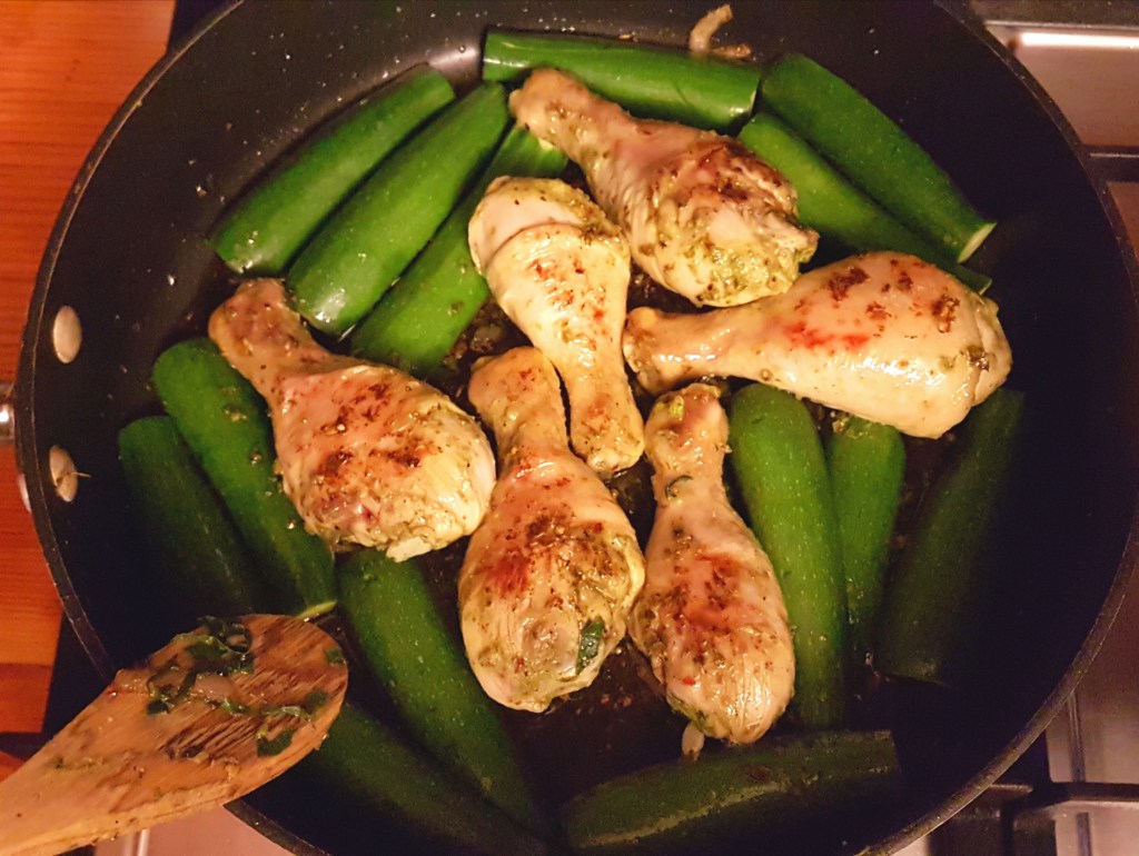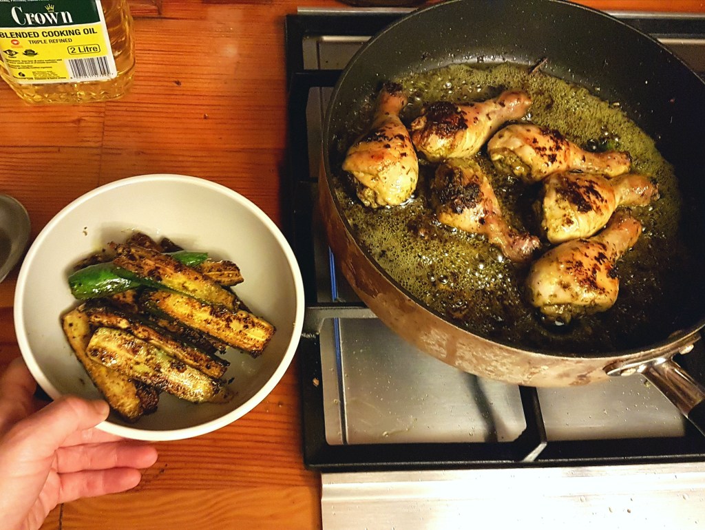 - Your courgettes should be soft but not mushy and nicely browned. Turn them over to check. If they’re ready, remove them from the pan and let them rest until the chicken is done.