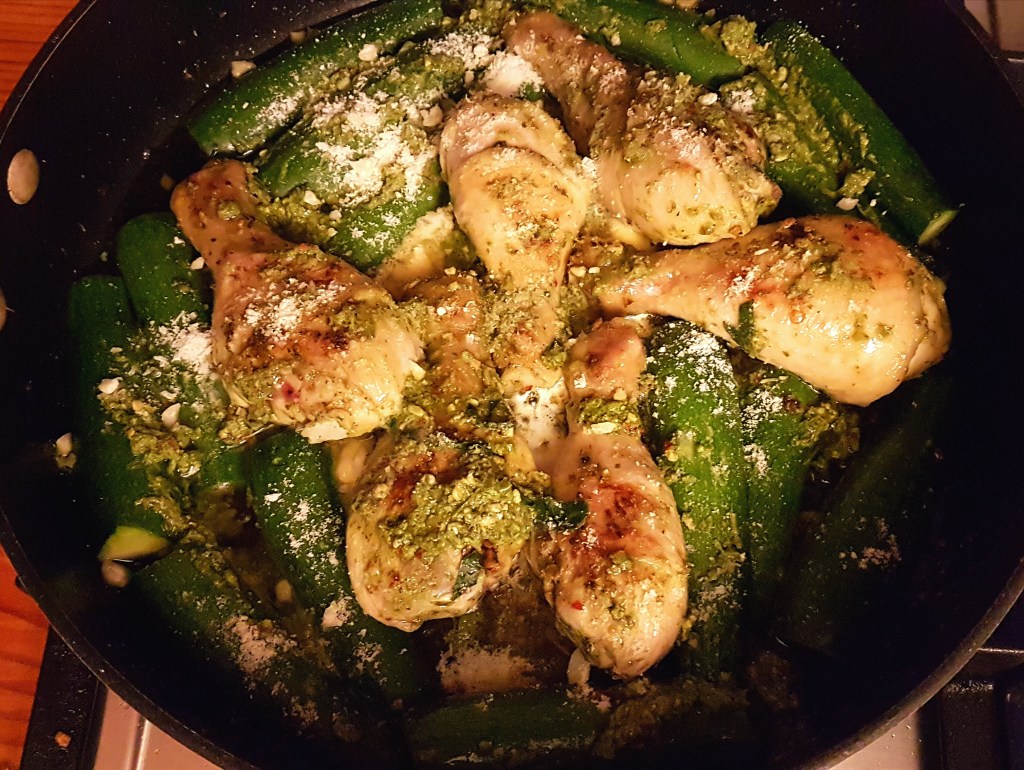 - Add any remaining basil pesto to the courgettes and chicken pieces. Use the back of your spoon to smear it on. Sprinkle some parmesan over it all, too.